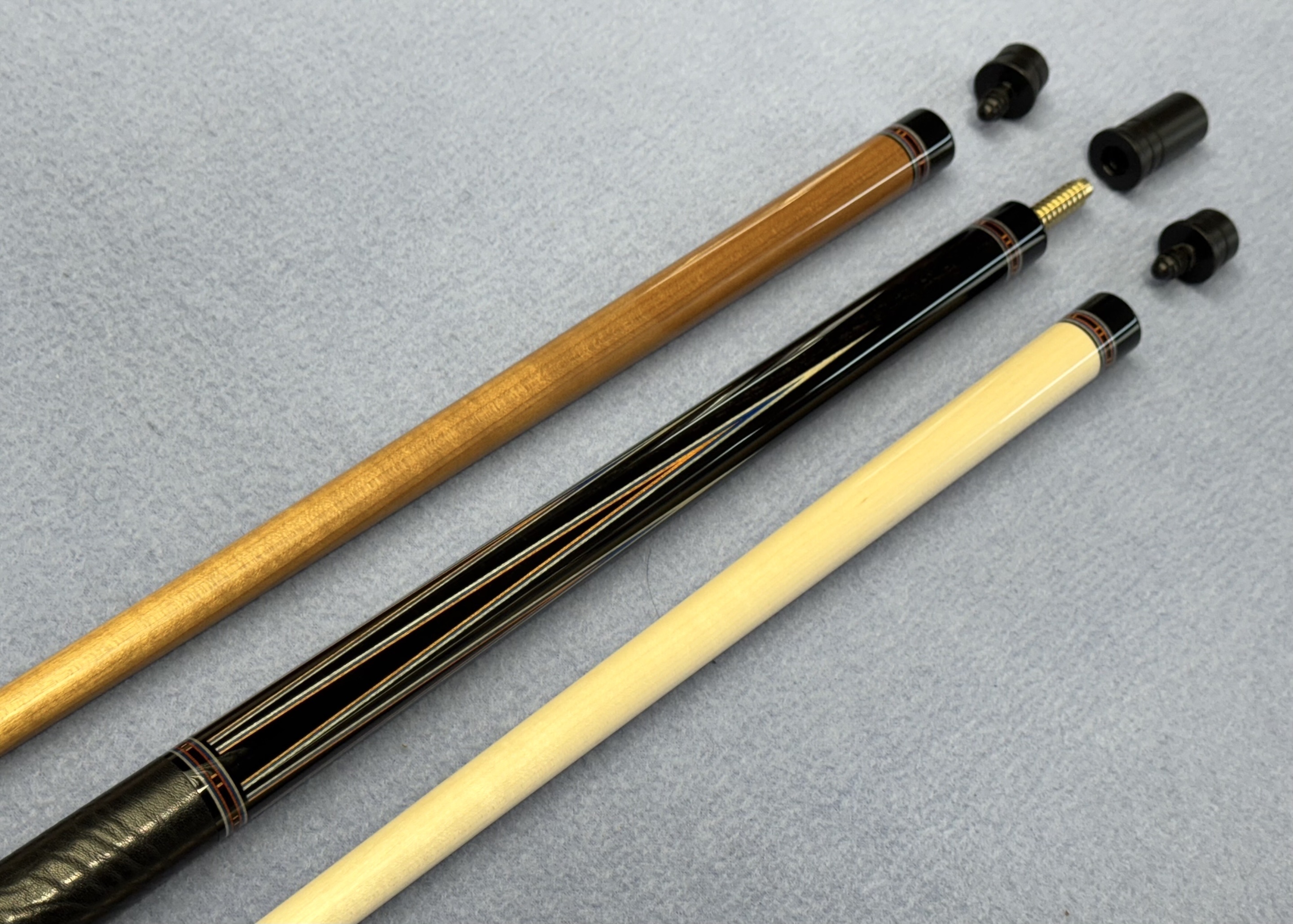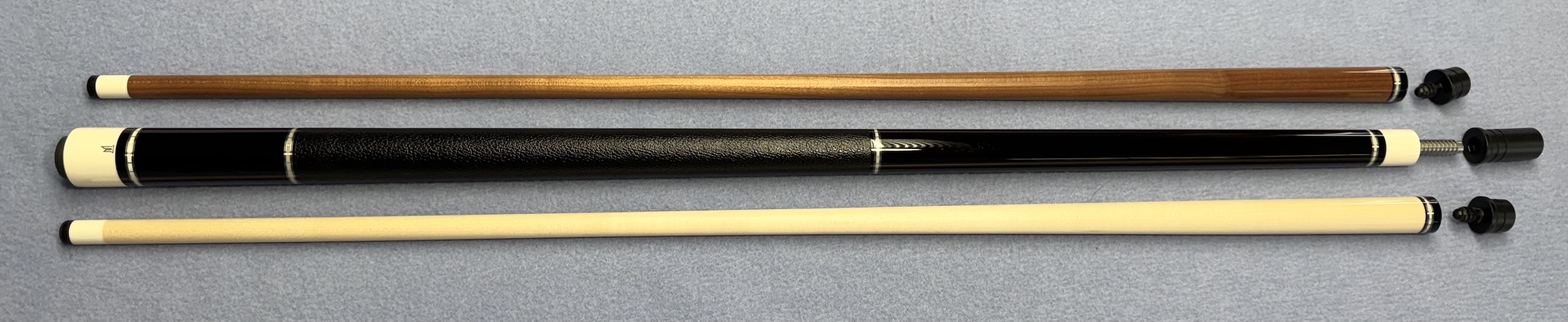 JP2404. Brand new 58" 4 point fullsplice (John Davis blank) Hoppe style wrapless cue, Beautiful curly purple heart into maple with black, natural, black and natural veneers. Dash deco rings at the joint. The white ferrules, joint and Hoppe ring material is white phenolic T-38. The pin is flat face modified 3/8-10. Two clear maple shafts, 12.9mm (3.78/ 3.87 oz.) with 1/2" ferrules and Triangle tips. Comes with set of black Delrin joint protectors for shafts and custom purple heart cap for the butt. The cue weighs 18.99/ 19.08 oz., with a 19" balance point. The price is $1875.00 Goods and Services PayPal, Visa or Mastercard shipped UPS 3 day insured with signature in the continental USA (Zelle price is $1820.00). Get a beautifully made 4 point full splice cue with veneers for the price of a Merry Widow!