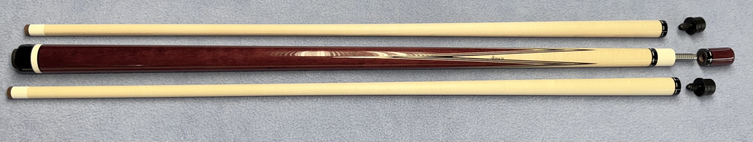 Pierce2404. Brand new 58" Jim Pierce 4 point fullsplice (John Davis blank) Hoppe style wrapless cue, Beautiful curly purple heart into maple with black, natural, black and natural veneers. Dash deco rings at the joint. The white ferrules, joint and Hoppe ring material is white phenolic T-38. The pin is flat face modified 3/8-10. Two clear maple shafts, 12.9mm (3.78/ 3.87 oz.) with 1/2" ferrules and Triangle tips. Comes with set of black Delrin joint protectors for shafts and custom purple heart cap for the butt. The cue weighs 18.99/ 19.08 oz., with a 19" balance point. The price is $1875.00 Goods and Services PayPal, Visa or Mastercard shipped UPS 3 day insured with signature in the continental USA (Zelle price is $1820.00). No waiting--I already did that for you!