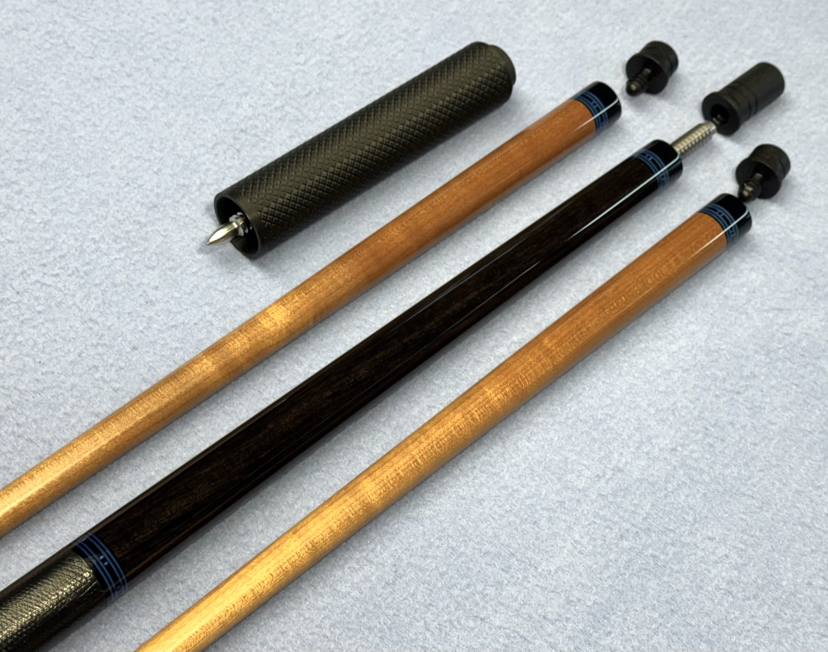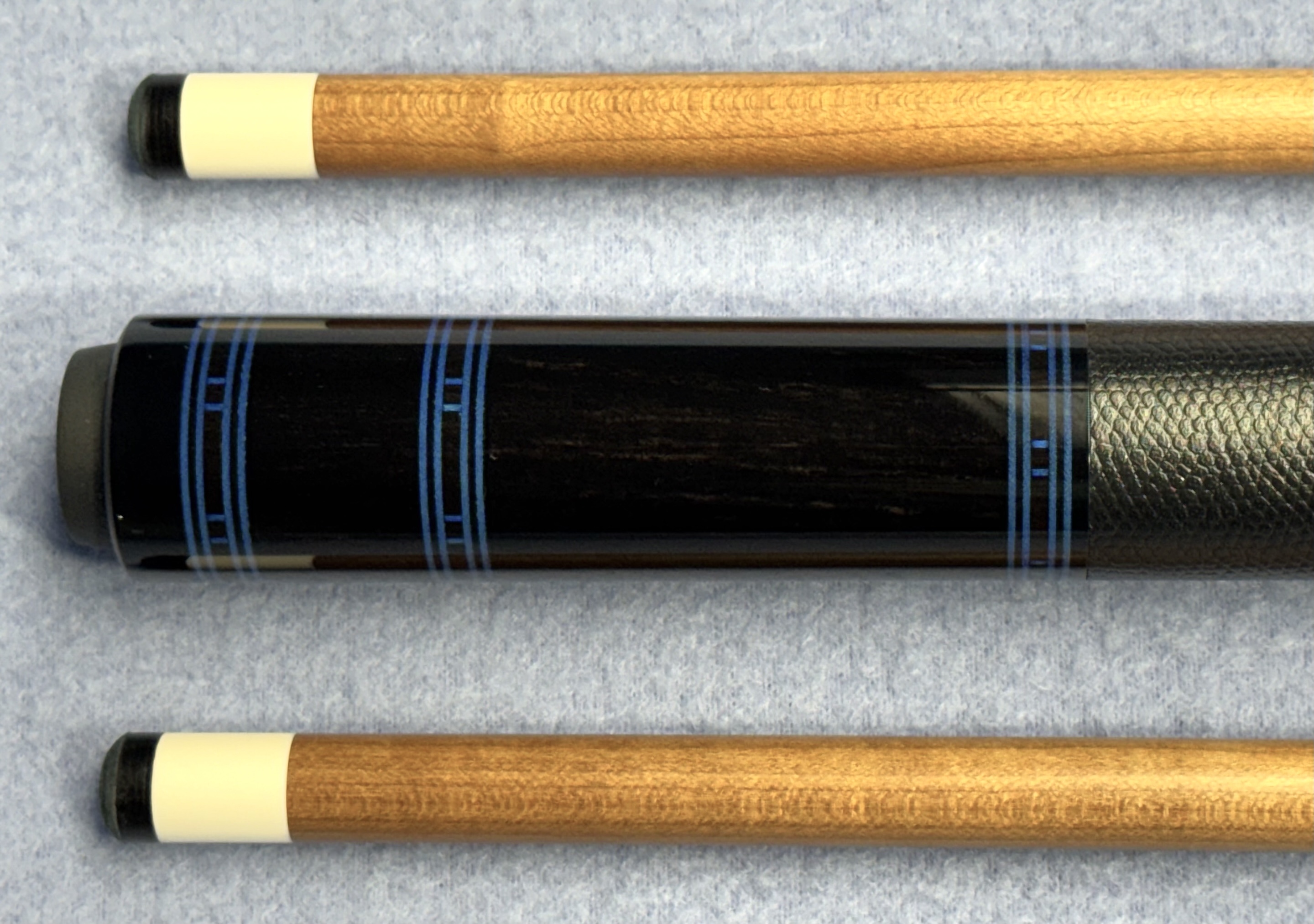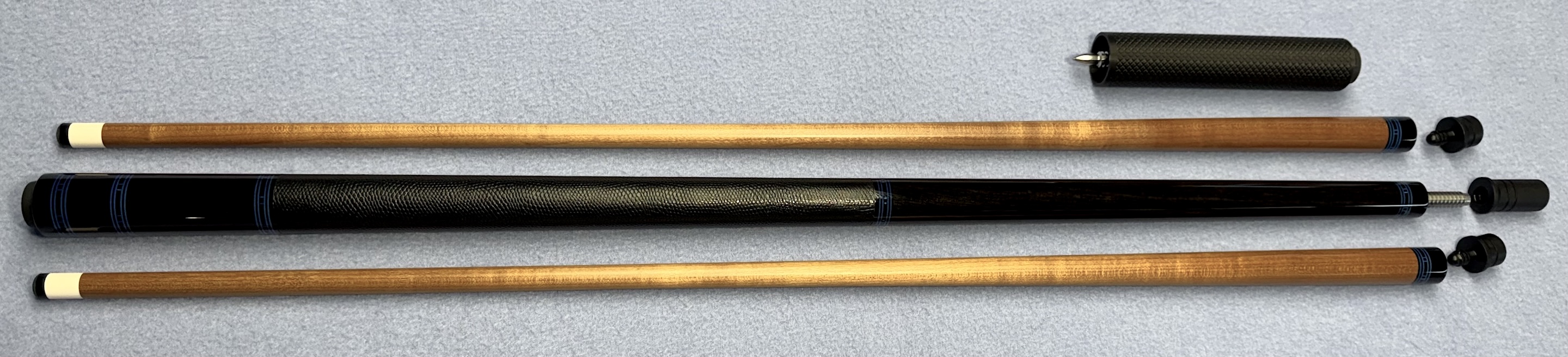 Pierce 2522. Another fabulous "Batman" SW style 58" Gaboon ebony merry widow cue from Jim Pierce. Outstanding builld quality. Has ebony and royal blue veneer deco rings at all positions. Black baby lizard texture leather wrap. 3/8-10 pin flat face joint. Two killwood shafts both 4.0 oz, 12.95mm with 5/8" T38 ferrules and Ultraskin medium layered tips. The cue weighs 19.43 oz with a 20-1/4" forward balance (the cue will feel lighter than it is). Comes with quick release rear 6" extension and black Delrin joint protector set. Ready to rumble! SOLD. No trades or other offers. Sales tax in California. USA sales funded from USA only.