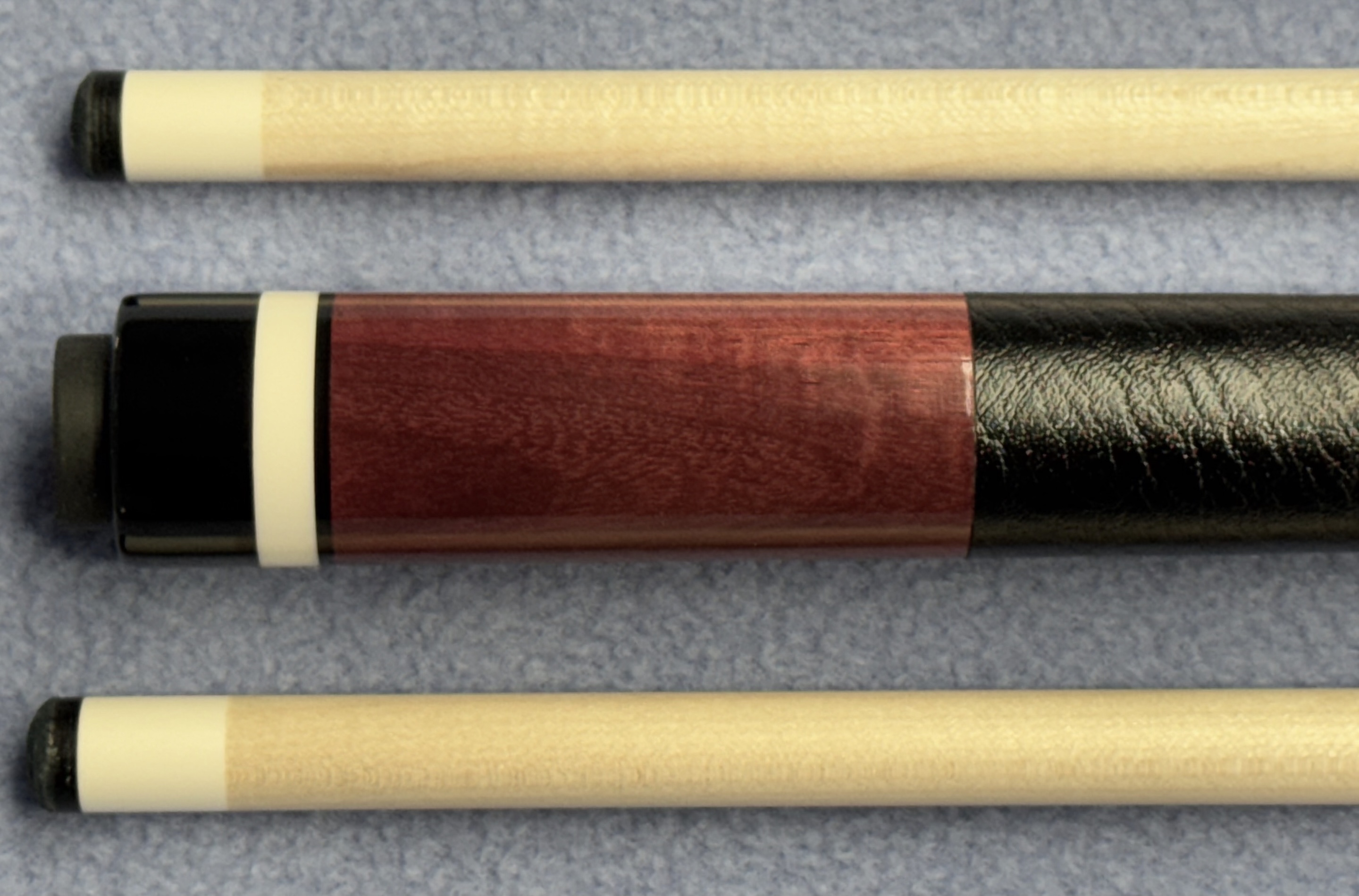 JP2404. Brand new 58" 4 point fullsplice (John Davis blank) Hoppe style wrapless cue, Beautiful curly purple heart into maple with black, natural, black and natural veneers. Dash deco rings at the joint. The white ferrules, joint and Hoppe ring material is white phenolic T-38. The pin is flat face modified 3/8-10. Two clear maple shafts, 12.9mm (3.78/ 3.87 oz.) with 1/2" ferrules and Triangle tips. Comes with set of black Delrin joint protectors for shafts and custom purple heart cap for the butt. The cue weighs 18.99/ 19.08 oz., with a 19" balance point. The price is $1875.00 Goods and Services PayPal, Visa or Mastercard shipped UPS 3 day insured with signature in the continental USA (Zelle price is $1820.00). Get a beautifully made 4 point full splice cue with veneers for the price of a Merry Widow!