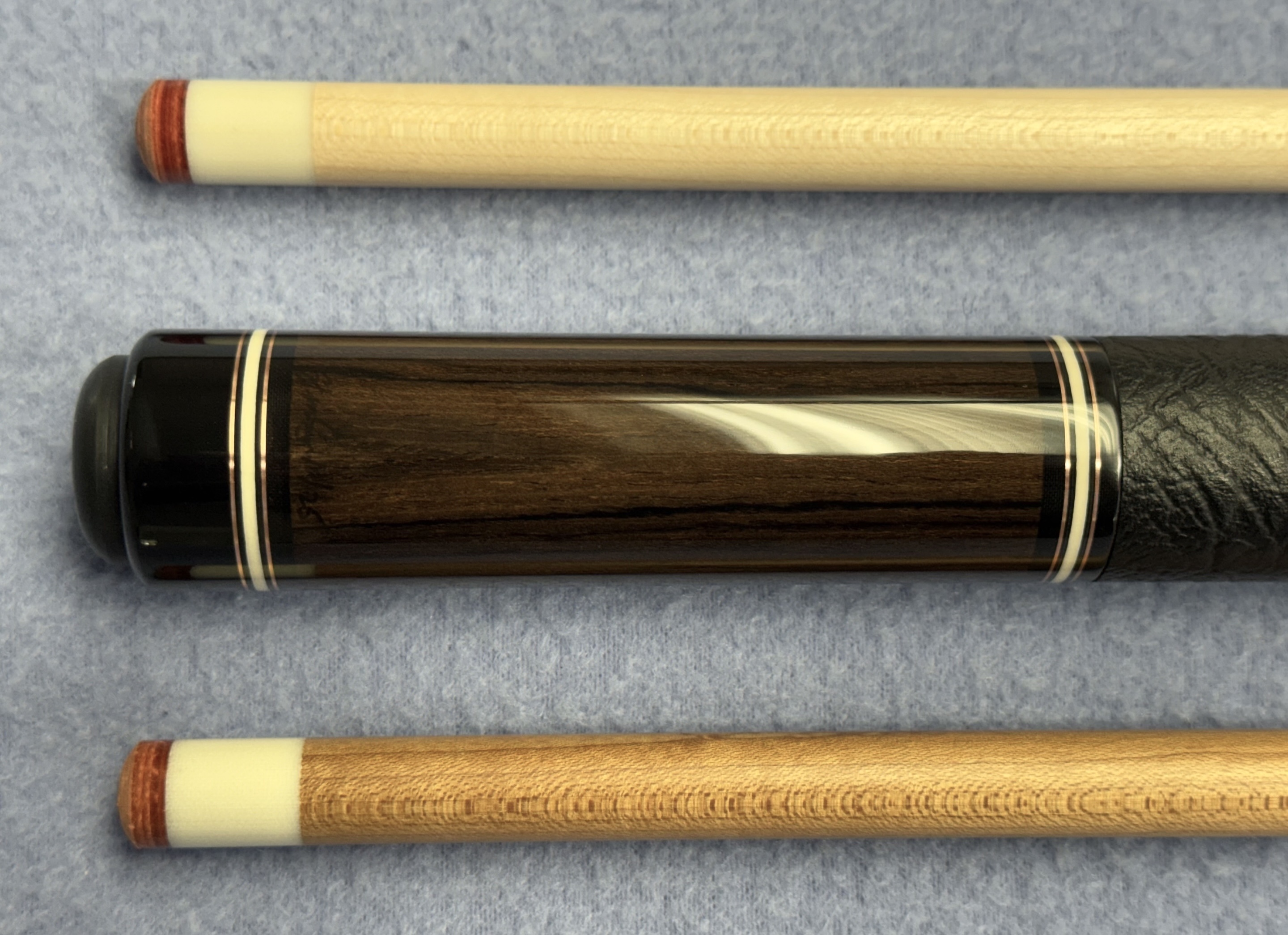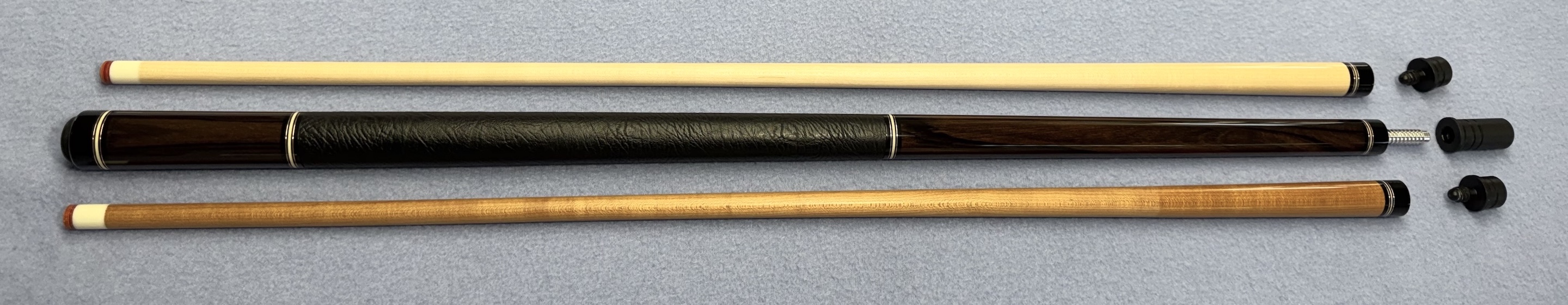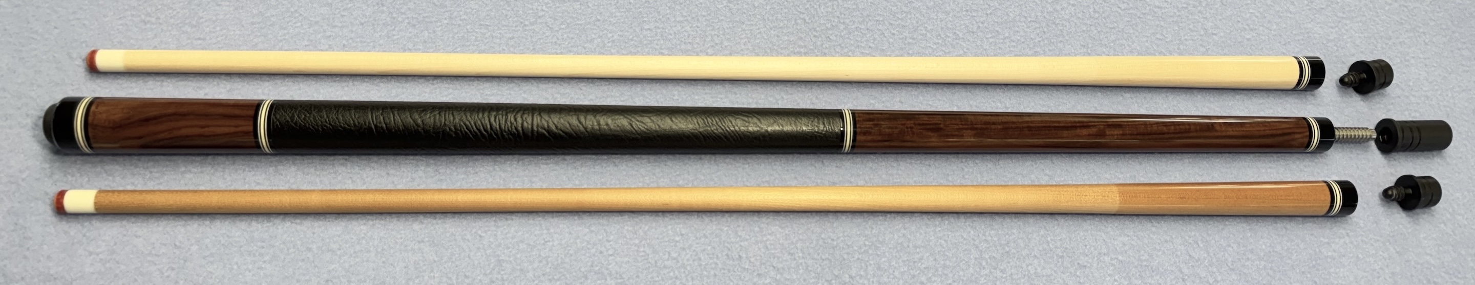 Serna 2501. 58" Bolivian rosewood (with small tight curl figure) merry widow cue with multiple black/white deco ringsets at all positions. Black bison leather wrap. Flat face 3/8-10 pin joint. 2 shafts 13mm, 5/8" linen melamine ferrules, One shaft is maple (3.70 oz.) and the other is roasted maple (3.65 oz.) with medium UltraSkin layered tips. Black Delrin joint protector set included as shown. The cue weighs 19.05/ 19.09 oz. with a 20" forward balance. No weight bolt. The price is $1,645.00 Goods and Services PayPal, Visa or Mastercard shipped 3-day UPS in CONUSA (or $1,595.00 Zelle).
