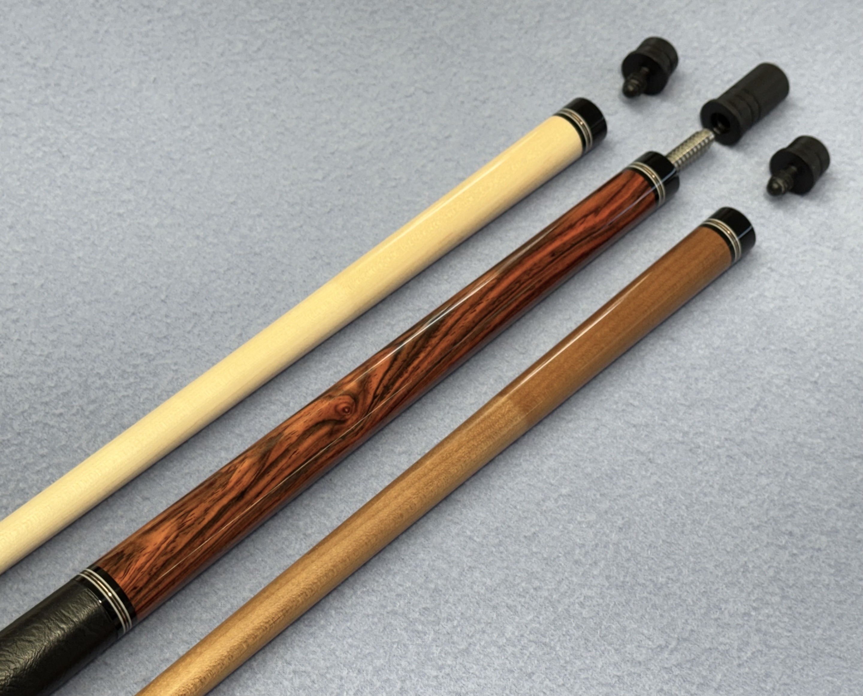 Serna 2503. 58" Mexican cocobolo with multiple black/white/copper deco ringsets at all positions. Black bison leather wrap. Flat face 3/8-10 pin joint. 2 shafts 13mm, 5/8" linen melamine ferrules, One shaft is maple (3.78 oz.) and the other is roasted maple (3.75 oz.) with medium UltraSkin layered tips. Black Delrin joint protector set included as shown. The cue weighs 19.10/ 19.13 oz. with a 19" balance. The price is $1,645.00 Goods and Services PayPal, Visa or Mastercard shipped 3-day UPS in CONUSA (or $1,595.00 Zelle).