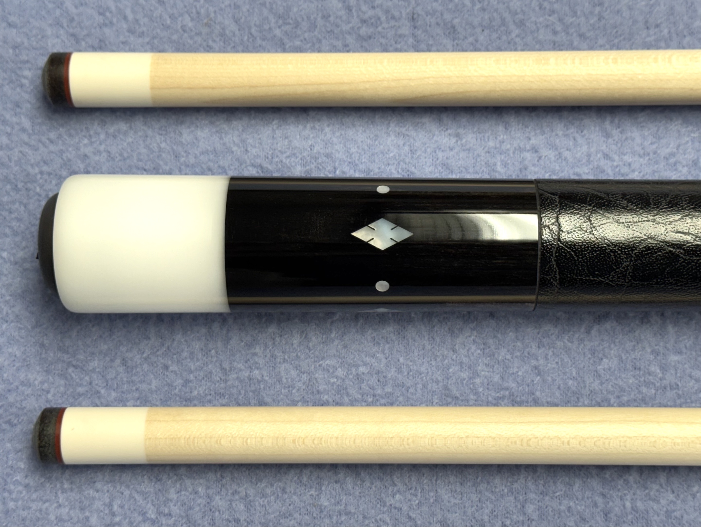 Tasc20. 58" Classic style 4 point 4 veneer (black, deep blue, orange-red and natural) ebony into highly figured hard curly maple. Piloted 5/16-14 steel joint. Mother of pearl slotted diamonds in points and in buttcap with dots in between. Veneer dash deco rings at joint. Very lightly textured black Buffalino leather wrap. Delrin buttcap. Two 13mm shafts with 3/4" Juma ferrules and medium hard Triangle tips on pads (4.10/4.16 oz.). Weighs 19.62/ 19.68oz. with a 19-5/8" forward balance (the cue will feel lighter than it is). $4,850.00 shipped and insured UPS overnight saver in CONUSA (Less 3% Zelle).